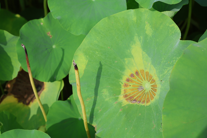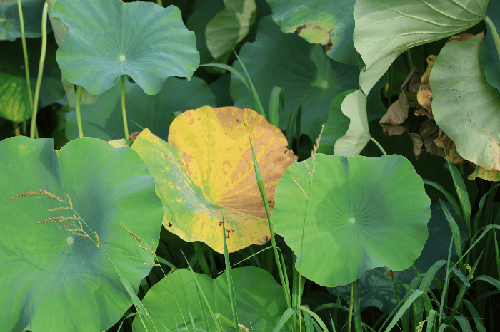 바래고 구겨진 잎은 시간의 흔적을 고스란히 담고 있다. 같은 연못 안에서 막 피어난 봉오리와 마른 잎이 공존하는 모습은 생의 양가적 모습을 잘 보여준다. 한쪽에서는 새 생명이 힘차게 솟아나고, 다른 한쪽에서는 이미 소멸의 길로 접어든다. 그러나 이 대조는 충돌이 아니라 조화를 이루며, 연못 전체를 하나의 순환 구조로 완성한다. 꽃과 잎이 서로 다른 시간을 살아가면서도 같은 공간을 공유하는 모습은, 인간 삶 또한 각기 다른 단계들이 모여 하나의 세계를 이루고 있음을 떠올리게 한다.