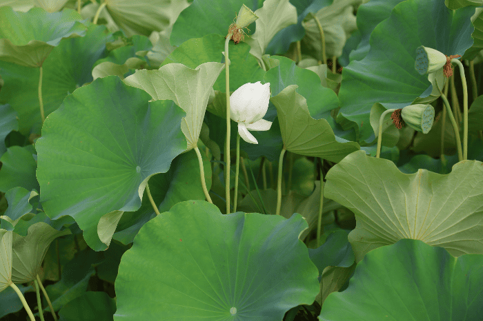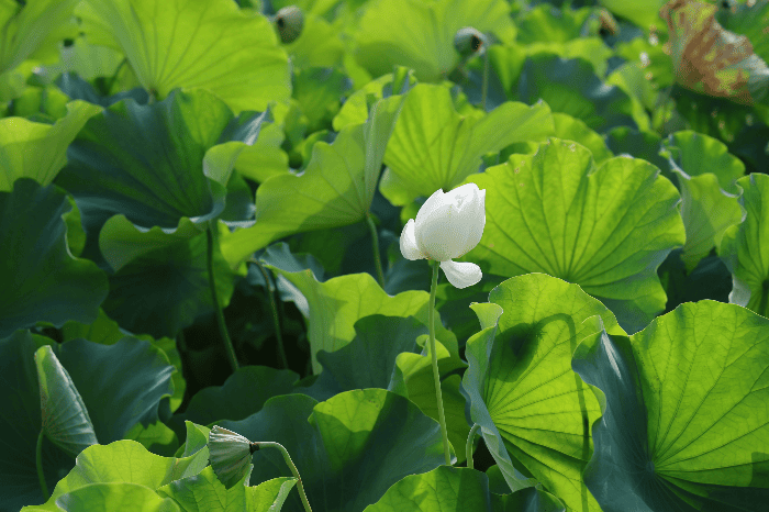 흰 연꽃은 초록빛 잎과 대비되며 더욱 선명하게 빛난다. 막 피어나려는 순간의 긴장은 형태적 아름다움과 더불어 자연이 만들어낸 극적인 장면이다. 햇살이 스며든 잎에는 세부 조직이 드러나며 다채로운 환상이 펼쳐진다. 역광 속에서 드리운 봉오리의 그림자는 오히려 그 존재를 더 생생하게 부각한다